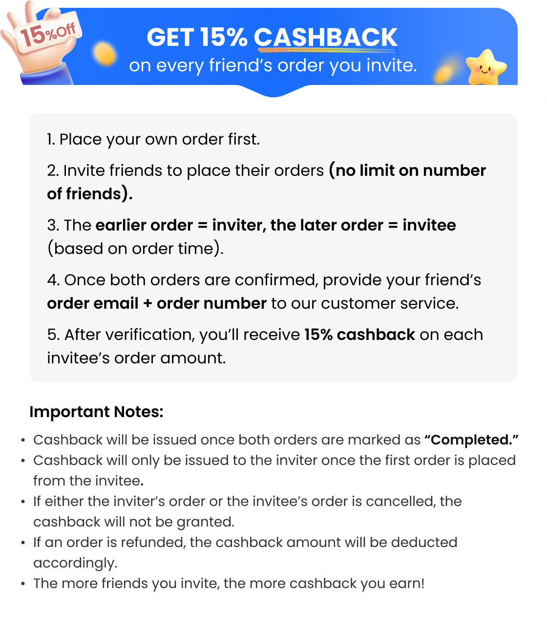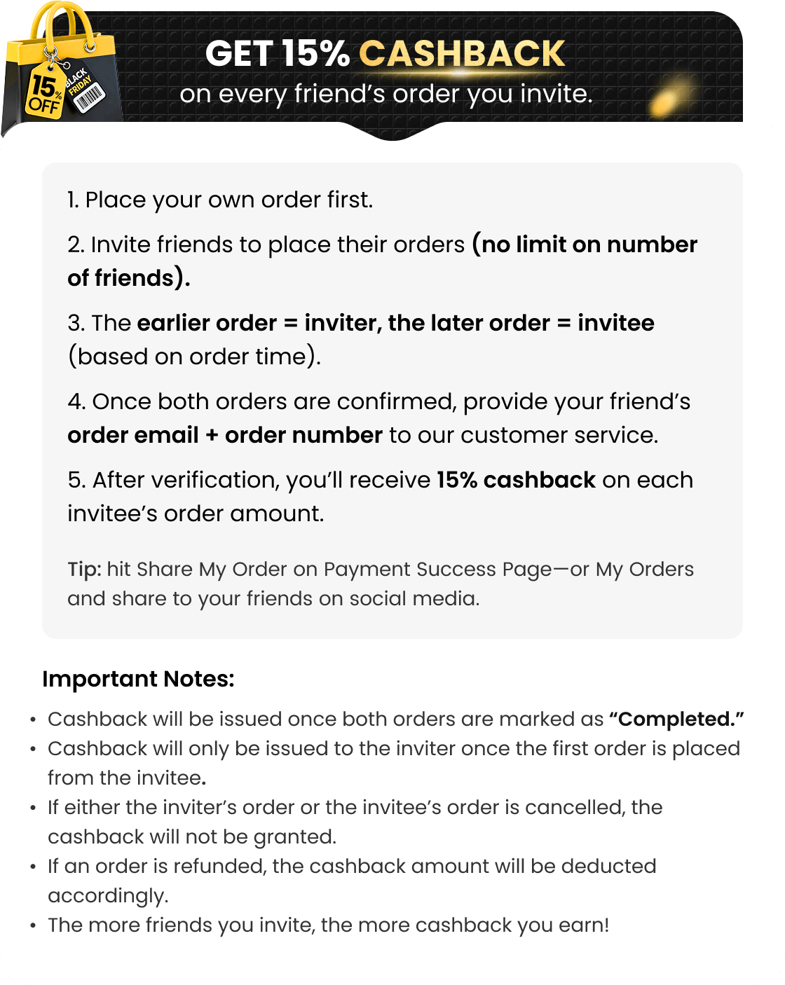 • Chance for a free order to share the experience! Earn 1,000 Points for Photo Reviews, $50 Cashback for Selected 15s+ Videos, and Win a FREE Order for Top-Quality Videos.
